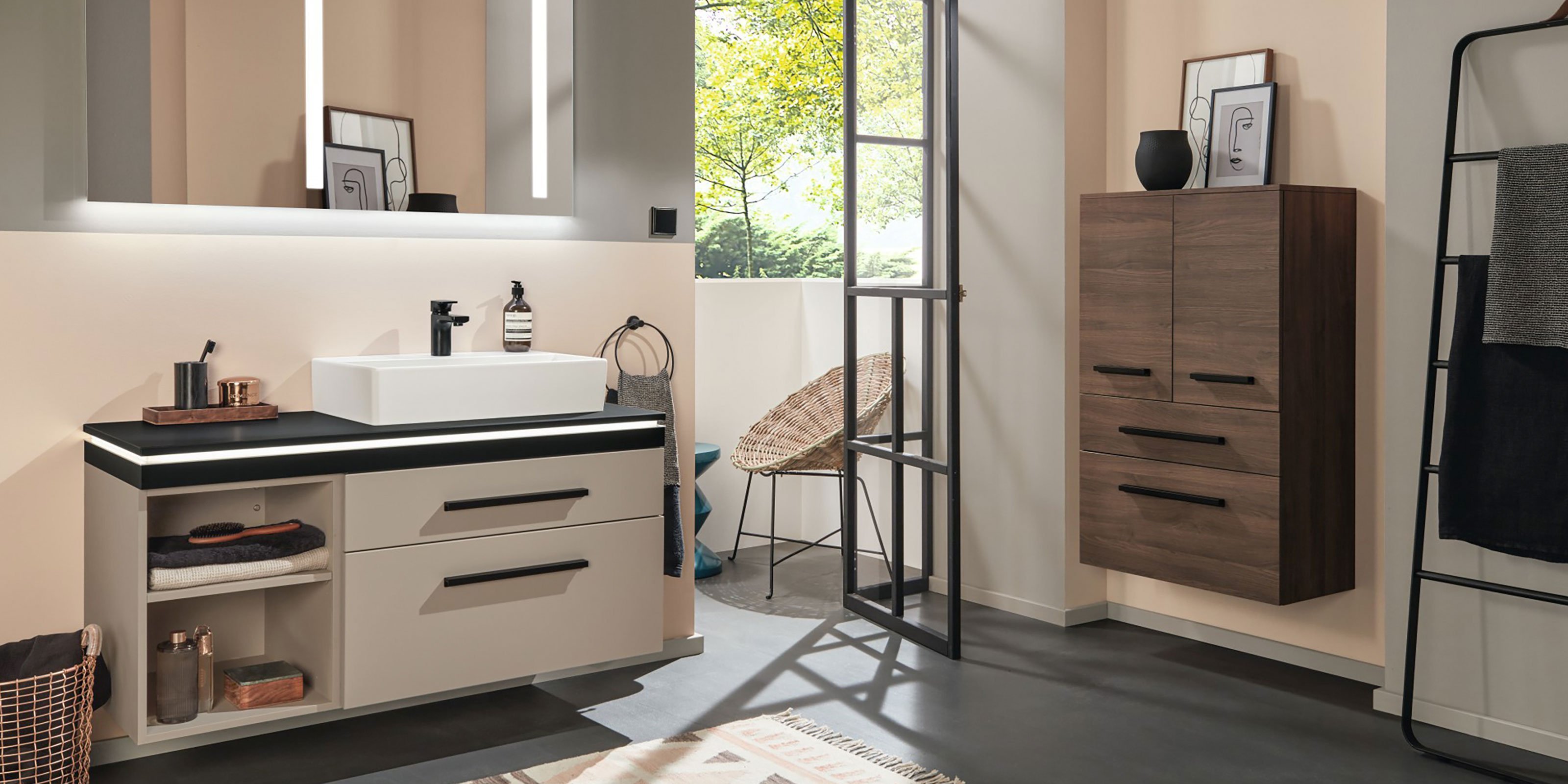 Die 2morrow Platte Light in Vulkan-Matt und die schwarz matten Griffe gebendem Waschplatz einen besonderen Touch. Ergänzt und akzentuiert wird das Bad mit demgeräumigen Mittelschrank in einem warmen Holzton. Die Beleuchtung der Platte und des variablen Reflection Lichtspiegels VIOLA ist durch intelligente Lichtsteuerung in Helligkeit und Lichtfarbe regelbar. Zeitgemäßer Look mit innovativer Technik.