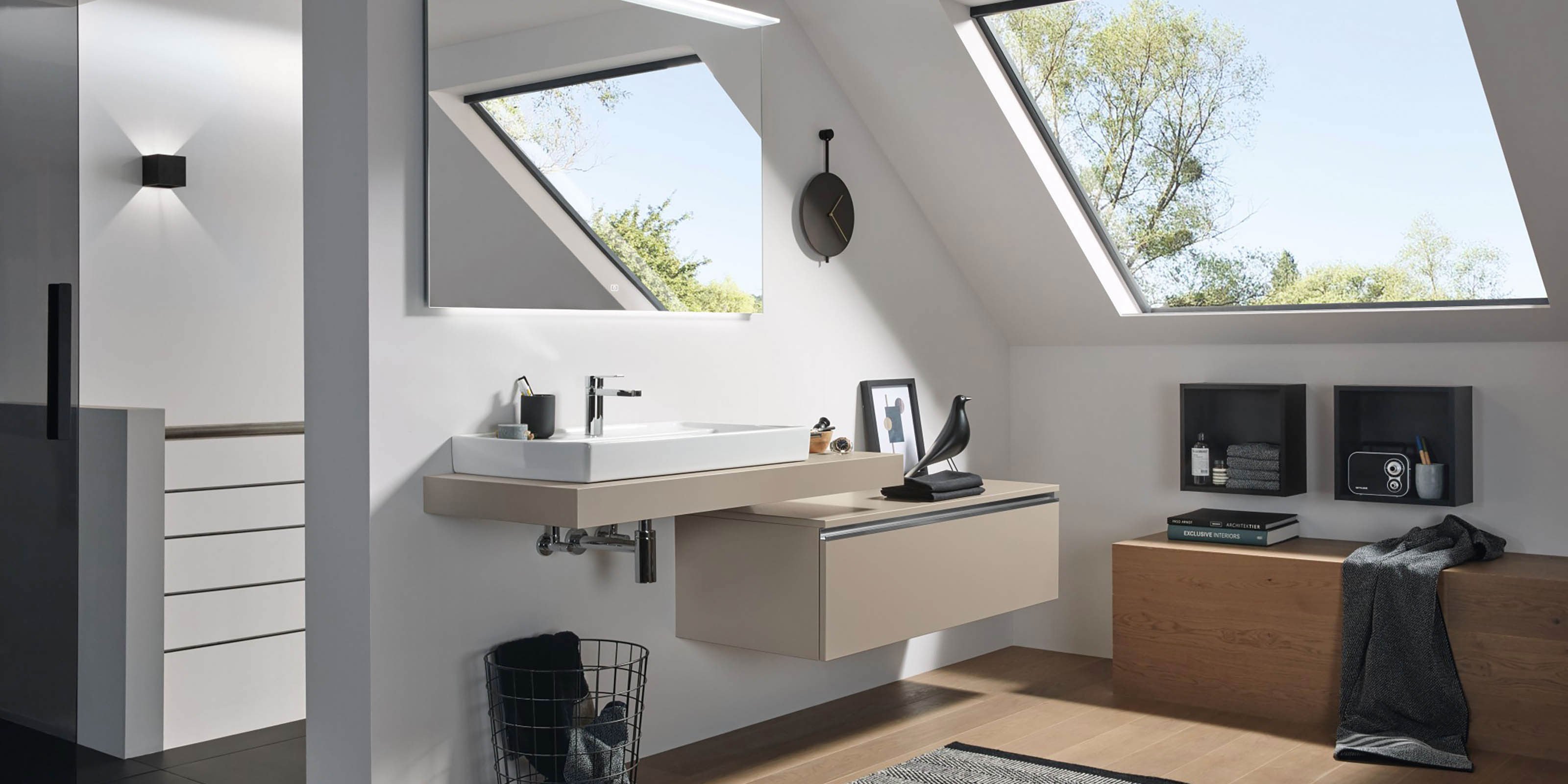 Extra-Slim, Slim-Light, Slim, Massivholz, Classic und Light in unterschiedlicher Optik – modellabhängig mit oder ohne LED, zusätzlich in Bi-Color. Flexible Gestaltung mit breiter oder schmaler vertikaler Platte. Fronten wahlweise mit Griff, mit Griffleiste oder grifflos mit integrierter Technik Push to open. Clevere Details wie ein Wäschebehälter im Schrank, eine Sitztruhe für mehr Komfort und vieles mehr. Maßflexible, offene Regale in nahezu allen Breiten ermöglichen auch in schwierigen Raumsituationen die passgenaue Planung. Verschiedene Keramik-Becken oder edle Glas-Waschbecken wählbar. Imposante Auswahl an Größen, Formen, Materialien und Farben für jeden Einrichtungsstil
